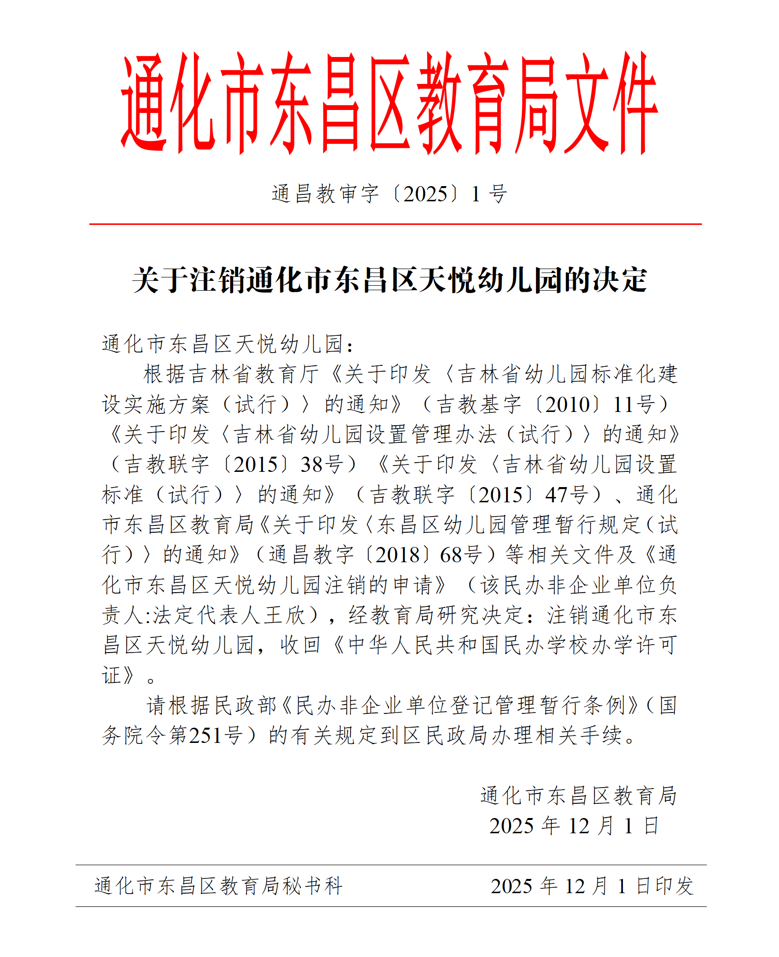 关于注销通化市东昌区天悦幼儿园的决定